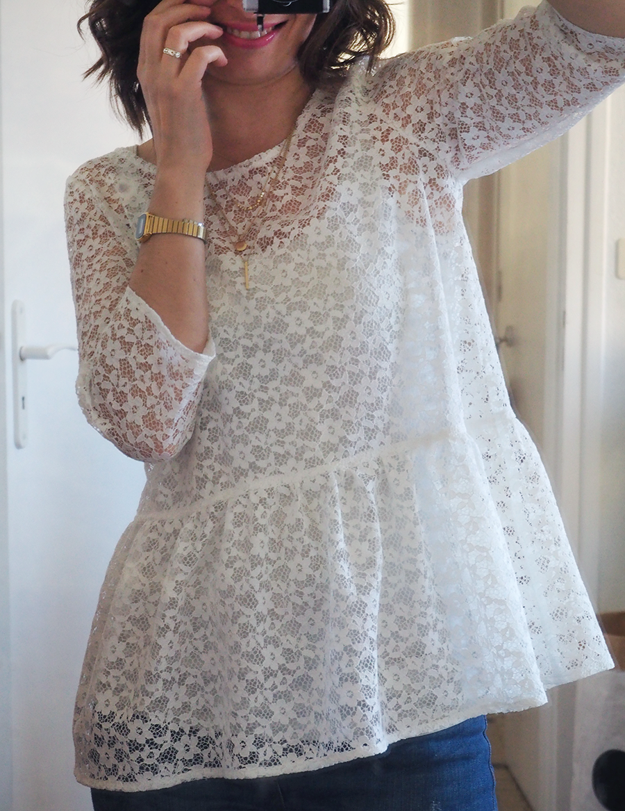 Et puis cette dentelle... Je porte beaucoup de blanc au printemps et en été et j'avoue que j'ai un faible pour la dentelle. On en voit d'ailleurs pas mal dans les magasins depuis l'été dernier. J'ai trouvé celle-ci chez Mondial Tissus à prix raisonnable (j'en ai eu pour 12€) ; pour une première je ne voulais pas choisir un tissu hors de prix. C'était cool, j'ai utilisé ses bords pour le bas des manches et de la basque, cela m'a simplifié les ourlets (juste un rentré et une piqure au point droit).